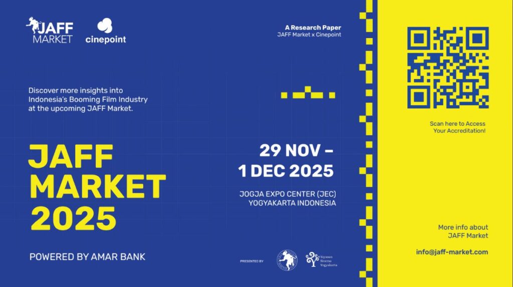 Momentum inilah yang menjadi sorotan JAFF Market, unit industri dari Jogja-NETPAC Asian Film Festival (JAFF), yang hadir di Asian Contents & Film Market (ACFM) di Busan, Korea Selatan pada 20–23 September 2025 untuk mempertunjukkan potret terkini perfilman Indonesia ke kancah internasional. Tahun ini JAFF Market menggandeng Cinepoint sebagai mitra resmi penyedia data dan memastikan hasil presentasi berbasis analisis mendalam dan