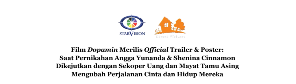 Jakarta, 14 Oktober 2025 — Starvision dan Karuna Pictures merilis official trailer dan poster film Dopamin karya sutradara Teddy Soeria Atmadja. Dalam official trailer & poster film Dopamin, menampilkan kisah pasangan muda Malik (Angga Yunanda) dan Alya (Shenina Cinnamon) yang baru saja menikah. Namun, keduanya dilanda kesulitan ekonomi sejak Malik terkena PHK. Malik, yang baru saja pulang wawancara kerja terkena musibah saat ban mobilnya